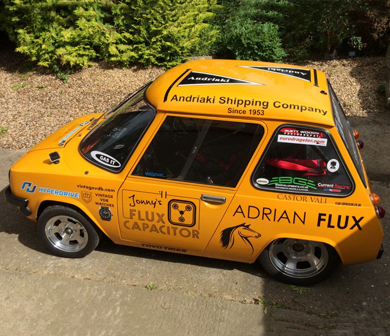 When Andriaki Shipping learned about a tiny piece of their rich history being put through its paces on the drag strip, they wanted to support the Flux Capacitor’s (e)mission statement to become the world’s quickest street legal EV. With such a close historical connection, I am incredibly proud to fly the Andriaki flag for British drag racing. Thank you.